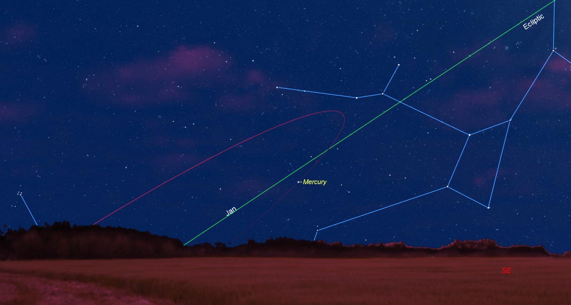 Mercury moves eastward in the sky and closer to the sun every day. It can be spotted near the east-southeast horizon in the middle of twilight — about 45 minutes before sunrise — for the first week of February. In the southern United States, it may remain visible for another week before sinking into the sun’s glare. On March 6, Mercury will be at superior conjunction, meaning it