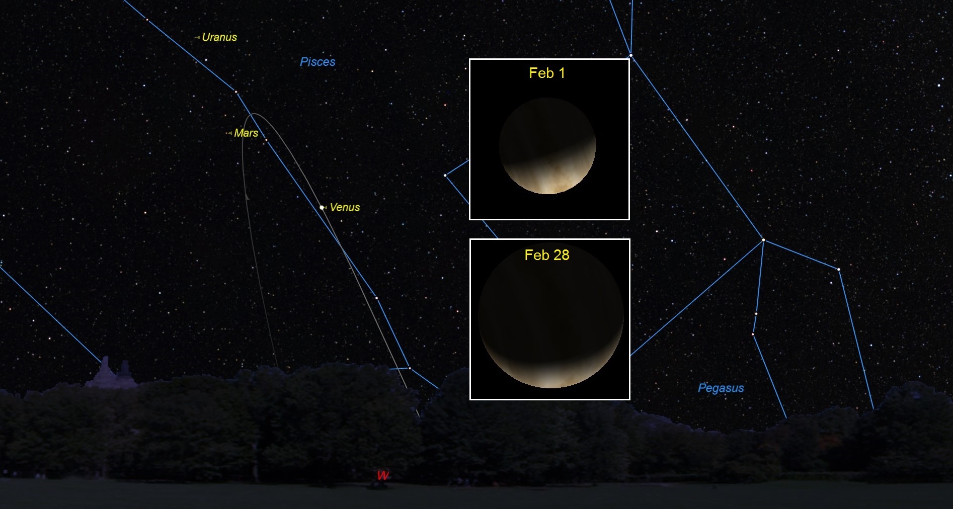 Mars remains 5.5 degrees to the upper left of Venus during the first four days of February. That will be as close as they come to each other before Mars pulls away from Venus to the east. The two planets present some interesting contrasts. The colors of Venus and Mars are sparkling white and ochre-orange, respectively. Mars remains visible against the faint stars of Pisces all month long, setting around 9:25 p.m. local time, and dims from magnitude +1.1 to magnitude +1.3 as it continues to recede from Earth, kicking off this month at a distance of 172 million miles (277 million kilometers) from Earth and moving out to 189 million miles (304 million km) by Feb. 28. You can use Mars to locate Uranus on Feb. 26 using a pair of binoculars. Uranus will appear as a tiny, greenish-blue star 0.6 degrees to the left of Mars. At magnitude +5.9, Uranus glows with only one-seventieth the radiance of Mars.