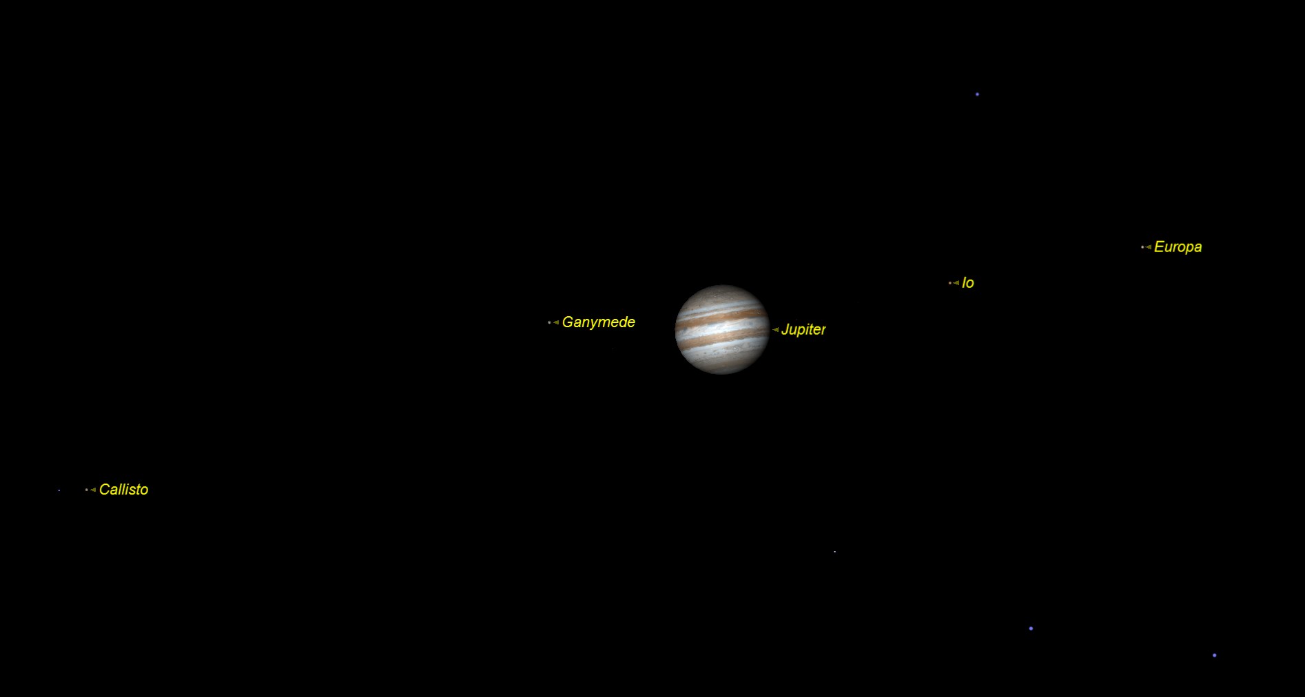 Jupiter rises brilliantly in the east around 11 p.m. local time in early February and will gradually rise earlier each day, coming up at 9 p.m. by month’s end. Once it lifts above the horizon, Jupiter easily outshines Sirius, the brightest star in the night sky, and will brighten from a magnitude of -2.1 to a magnitude of -2.3 during the month. On Monday, Feb. 6, the planet will appear to halt as it begins retrograde (westward) motion relative to the background stars of Virgo. Feb. 23 marks the second of three conjunctions in 2017 of Jupiter with Virgo’s brightest star, Spica; Jupiter will pass 4 degrees to the north of the star. The third and final conjunction in the series will come on Sept. 5. Jupiter doesn’t come to opposition until April, so this means that skywatchers need to stay up late for “Big Jupe” to rise high enough to show a clear image in a telescope. Telescopes can show a bounty of cloud features on Jupiter as well as its four bright moons. This month, the planet’s apparent diameter grows by more than 7 percent as the distance between Jupiter and Earth shrinks. Look toward the east-southeast at 11 p.m. local time on Feb. 14 to see a waning gibbous moon standing high above Jupiter. On the following night, the moon will have moved well to the lower left of Jupiter.